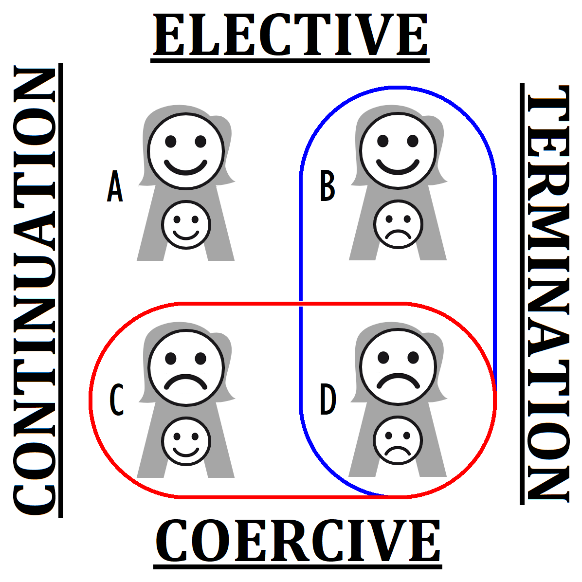 It is universally accepted that the best type of pregnancy is A, and the worst is D. Type A is the best because both of its qualities (election and continuation) are good, and type D is the worst because both of its qualities (coercion and termination) are bad. As for types B and C, it is universally debated which of those two is worse. More on B and C later.