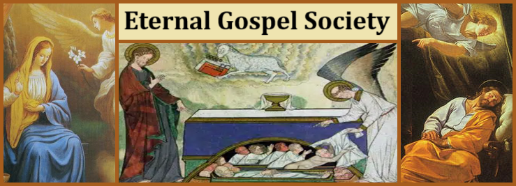 Welcome to the website of the Eternal Gospel Society, or EGS. A heavenly angel is holding an eternal gospel, and since it must be brought to everybody on earth (Rev. 14:6), not just the unbaptized but also the baptized, it consists of two messages: the Gospel of Christ for the unbaptized (1Co. 15:3-4) and a neangel for the baptized. The Greek neangelia means "new message" (from neos which means new and angelia which means message).